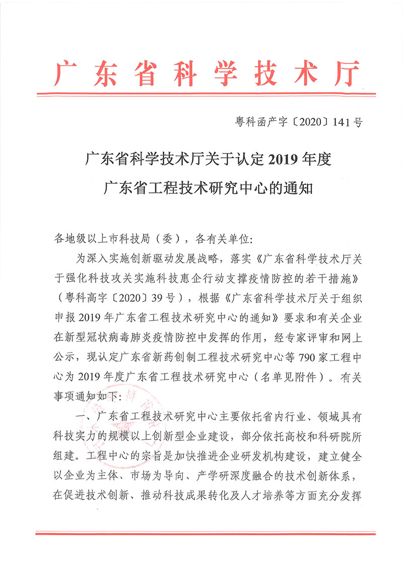 于2019年認定為廣東省工程技術研究中心
